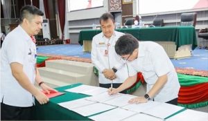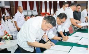 Selanjutnya, acara dilanjutkan dengan penandatanganan perjanjian kinerja dan pakta integritas oleh Wali Kota, Sekretaris Daerah Kota Manado, Dr. Micler Lakat, S.H., M.H., bersama para Asisten, Staf Ahli Wali Kota, Kepala SKPD, Kabag Setda Kota Manado, para Camat, serta Direktur RSUD dan RSKGM Kota Manado. (adve)